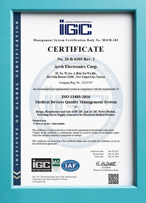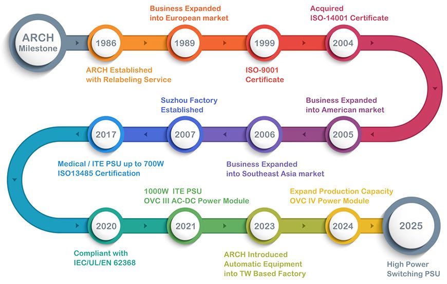 Founded in 1986 and headquartered in Taiwan, ARCH Electronics Corp. is a leading designer and manufacturer of energy-efficient power solutions. With in-house manufacturing facilities, we offer a comprehensive portfolio that includes encapsulated AC/DC power supplies, DC/DC converters, and specialized medical modules. Certified under international standards such as ISO 9001, CE, UL, and TUV, we are committed to continuous innovation, energy efficiency, and sustainability.