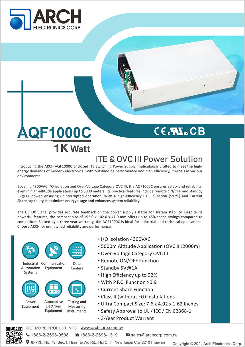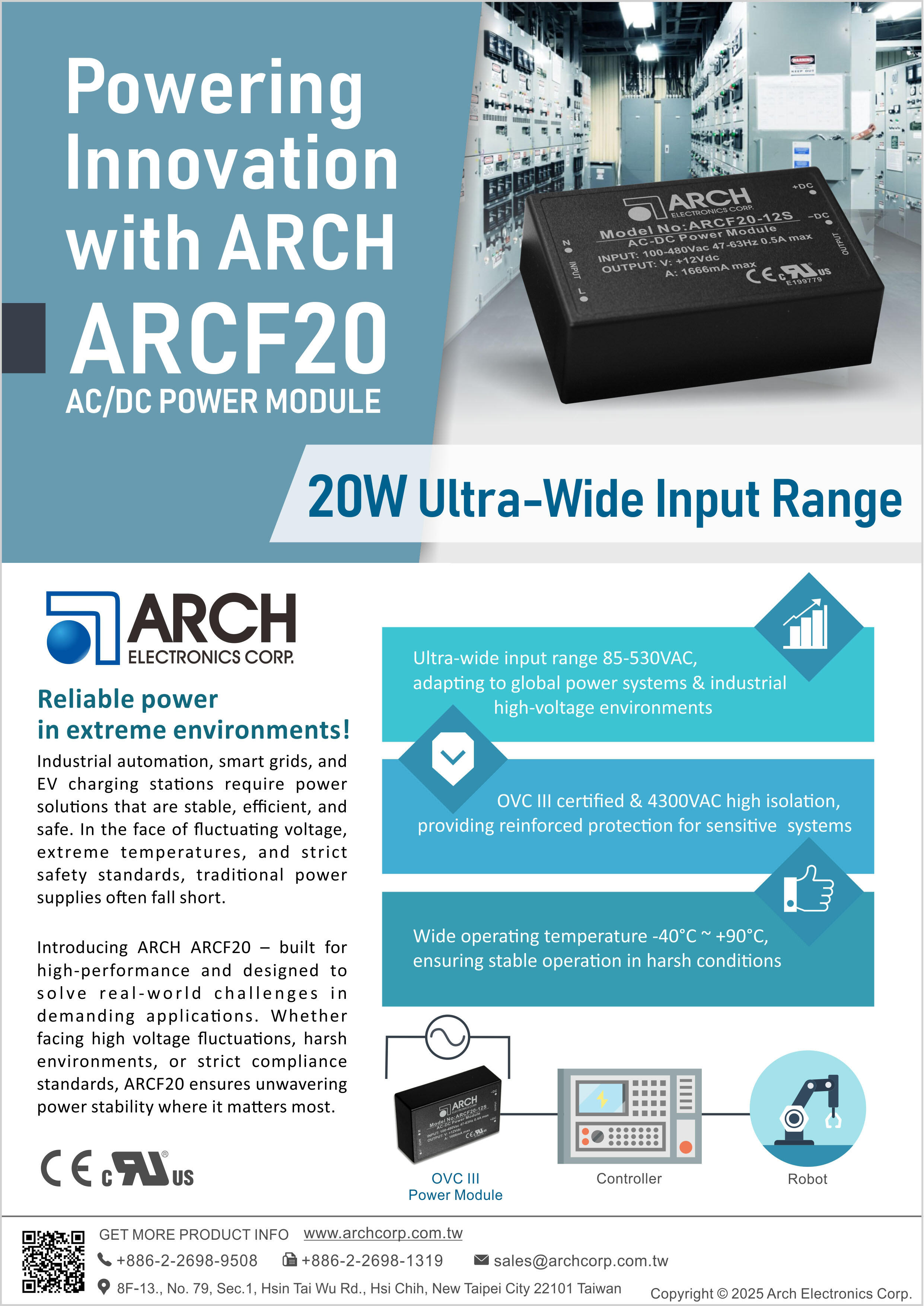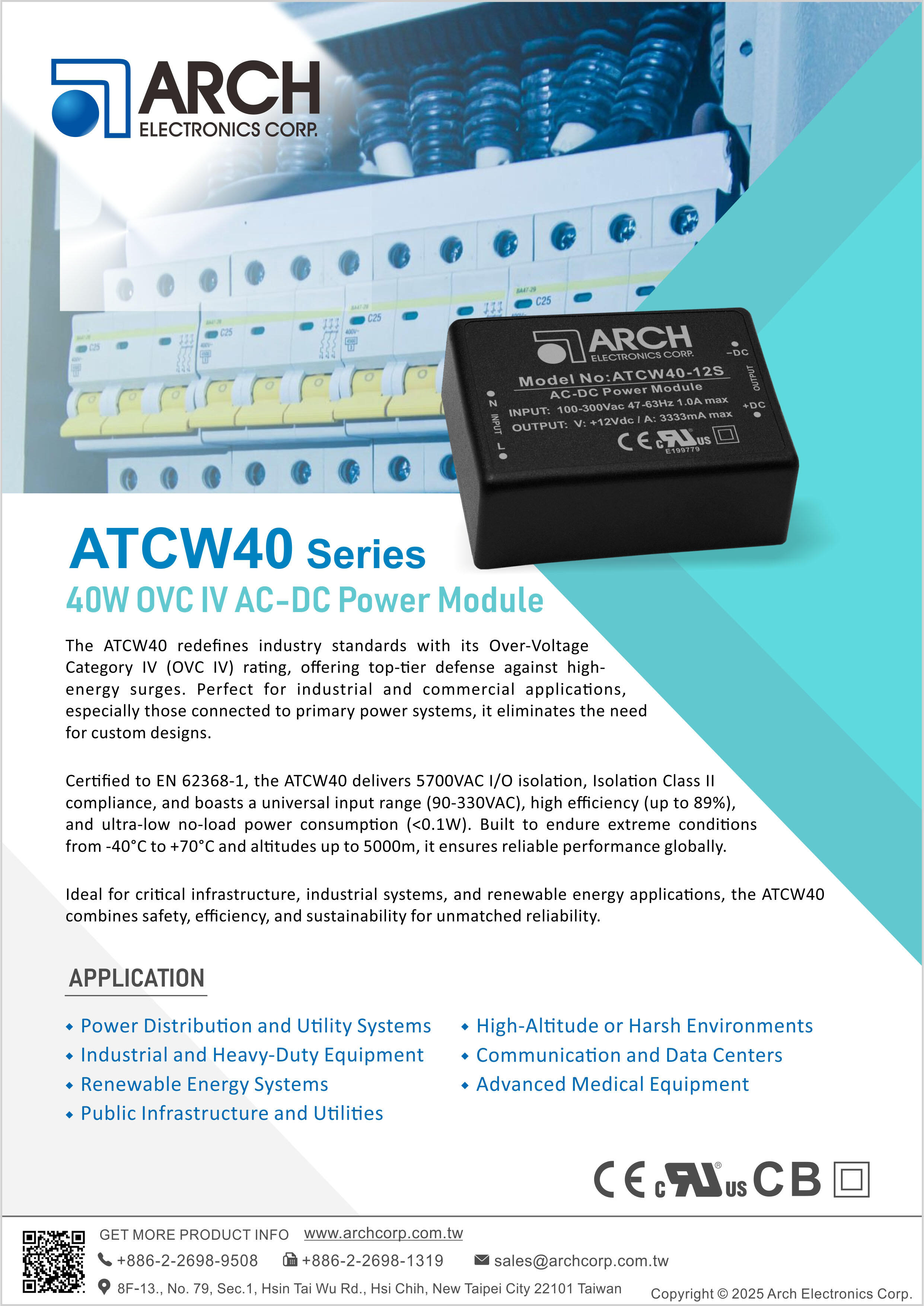 In smart grid and energy storage systems, power modules are more than just energy sources—they are critical to safety, stability, and energy efficiency. ARCH Electronics offers a full spectrum of solutions from 20W to 1000W, featuring OVC III/IV compliance, semi-potted designs, high efficiency, ultra-low standby consumption, and integrated protection. Empower your designs with smart, safe, and scalable energy solutions from ARCH.